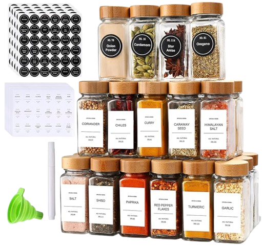 This set offers the flexibility to store spices either upright or flat, while still allowing you to read the labels. Since I store my spices vertically in a drawer, I appreciate that the black stickers fit on the lids. They're organized alphabetically, making it easy to find the spice I need.